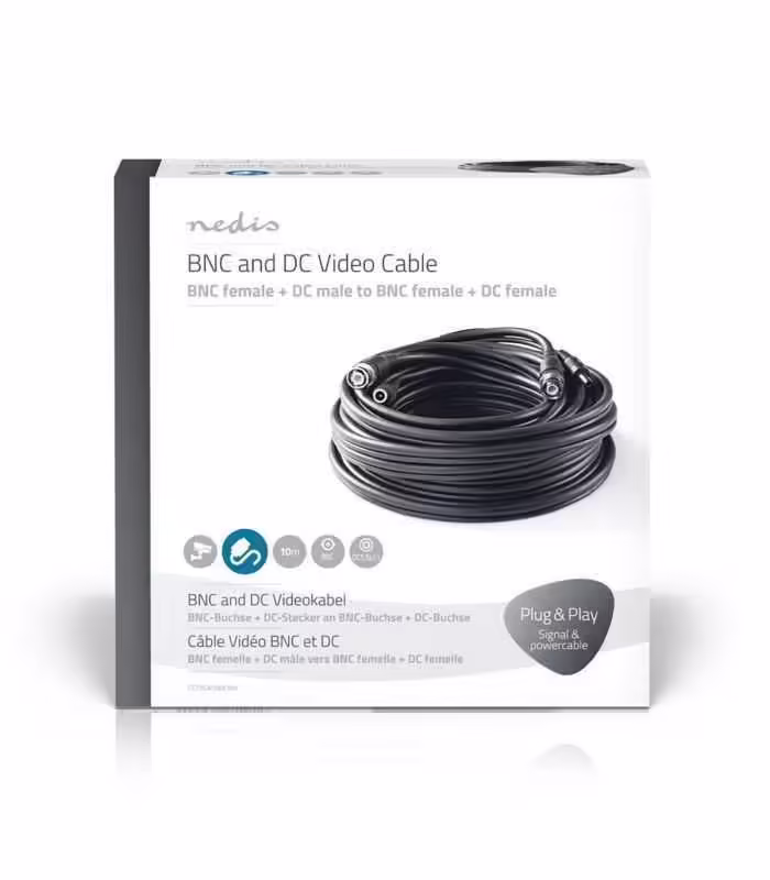 Cablu coaxial de securitate BNC + DC 2.1×5.5mm CCTV RG59 10m conectori preasamblati Nedis CCTVCA10BK100.