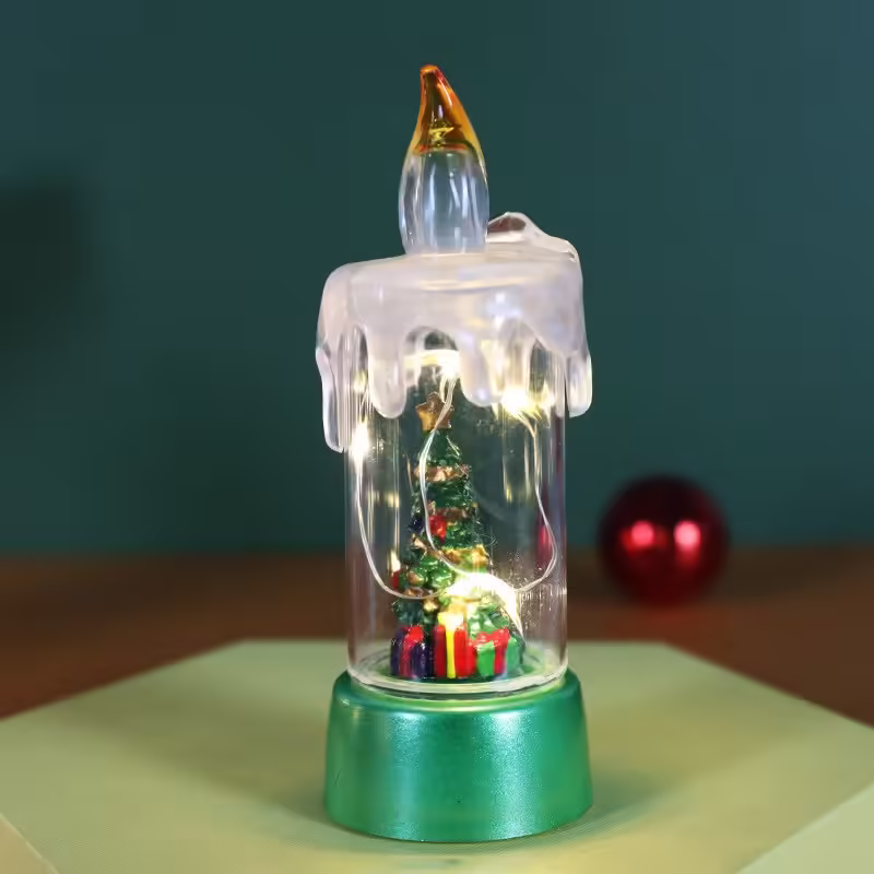 Decoratiune de Craciun tip Lumanare, Flippy, Lumanare de Cristal fara Fulgi de Zapada, Model Brad, Iluminare LED, 13 x 5 x 5 cm, Baza Verde, Transparent