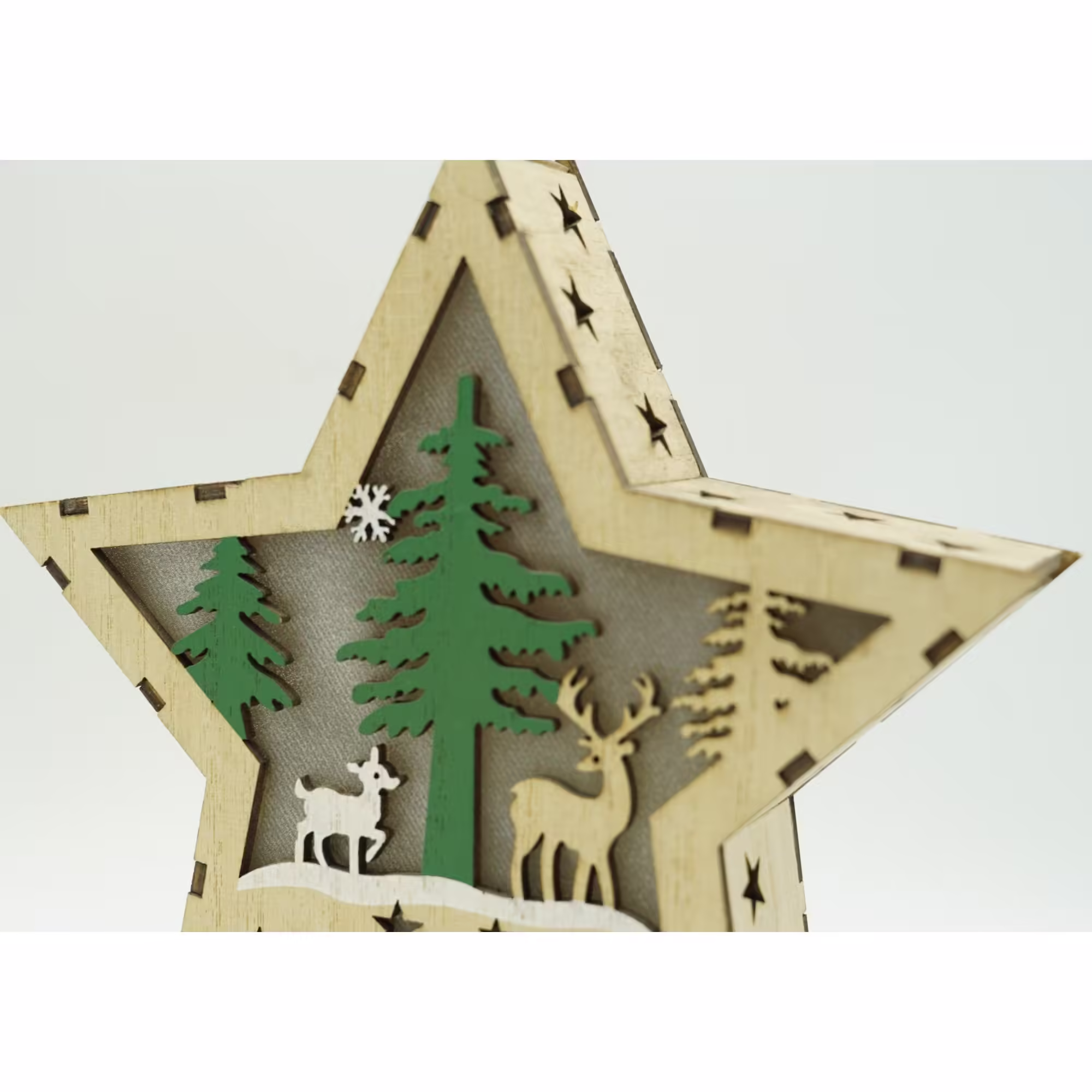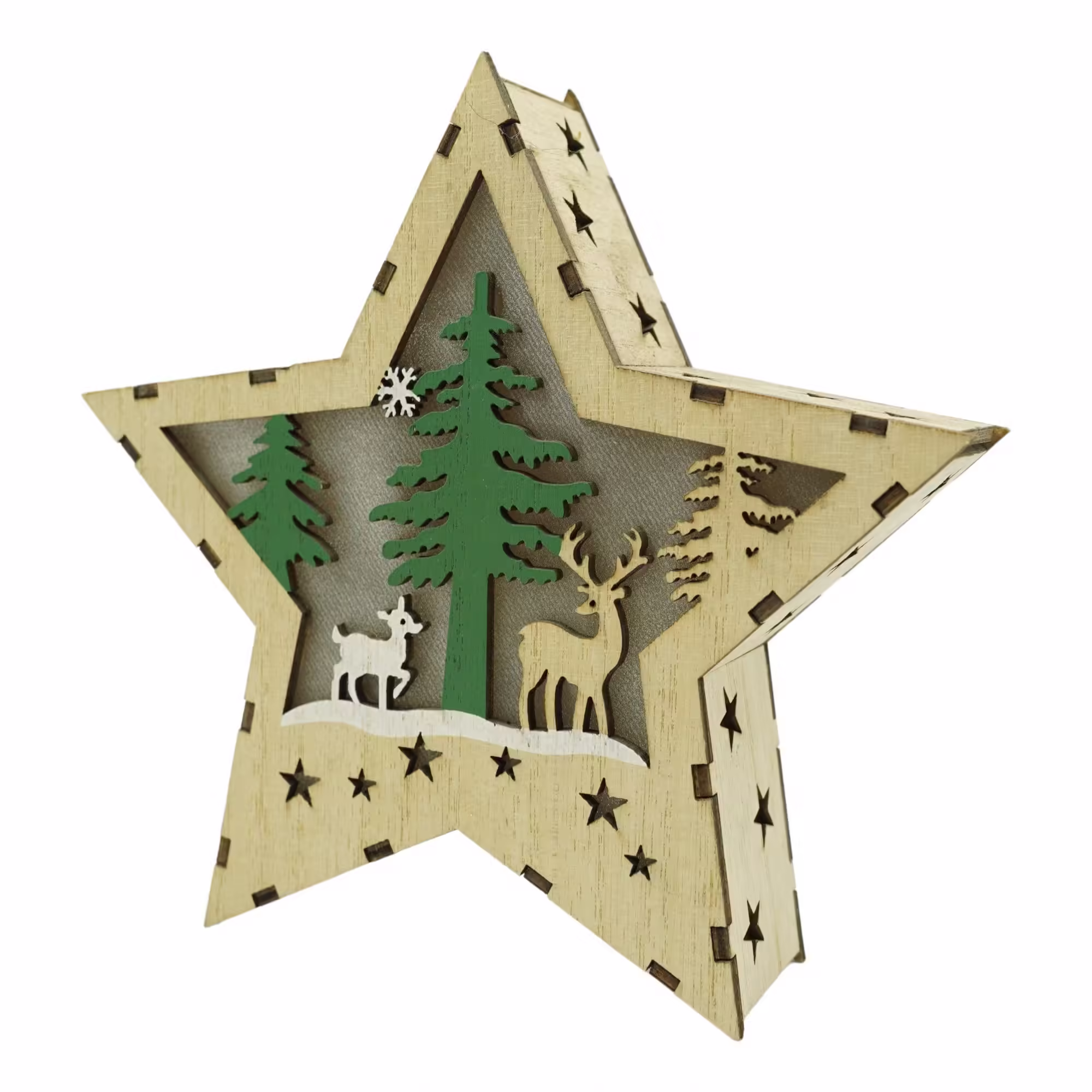 Decoratiune luminoasa, model de Stea cu Reni, maro, lungime: 18 cm, latime: 18 cm, inaltime: 4 cm, lemn, interior/exterior