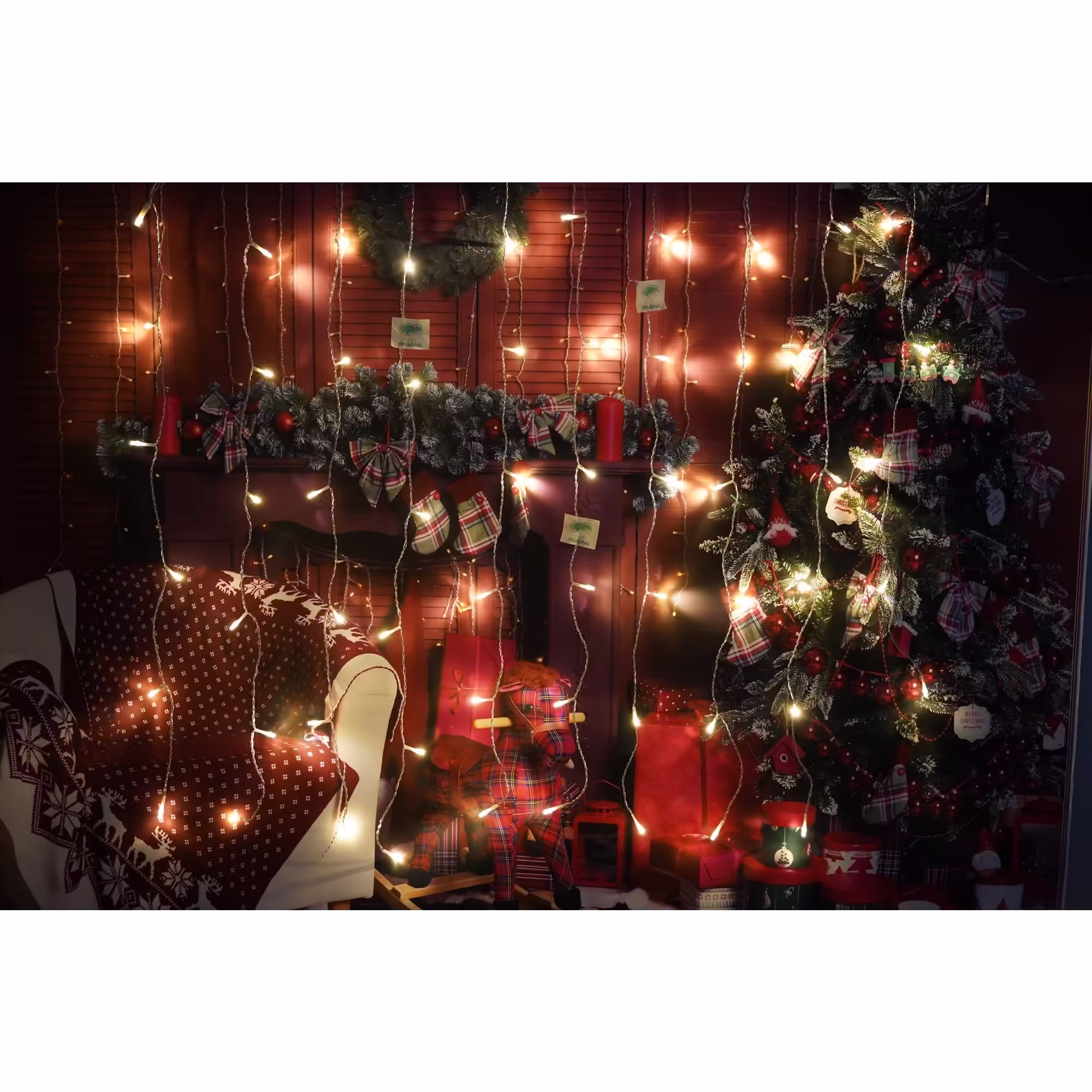 Instalatie Craciun, Tip Perdea, IP44, 3 m x 1 m, 180 LED-uri, Alb cald, 8 jocuri de lumini, Transformator, Interconectabila, Prelungitor 5 m inclus, Fir transparent, Interior/ Exterior, Flippy