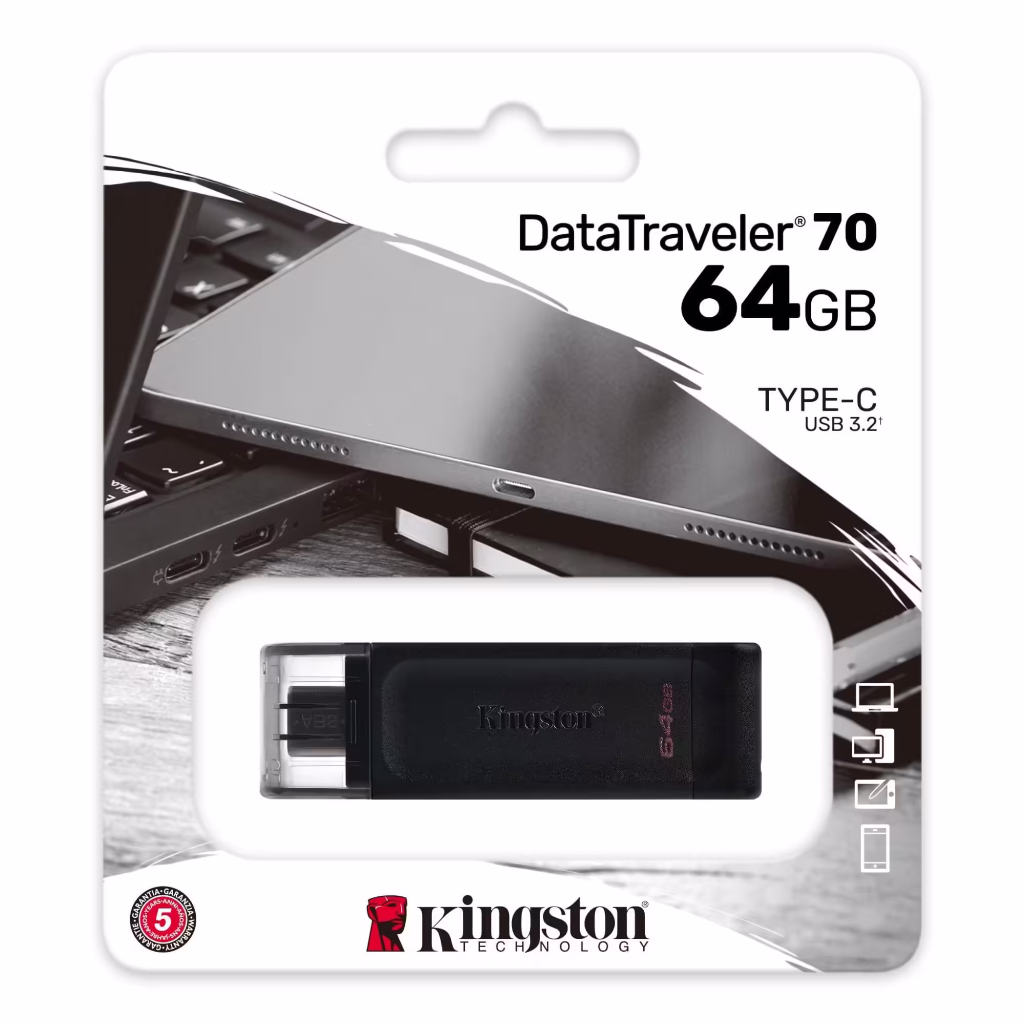 DataTraveler 70 Kingston este o unitate flash USB-C portabila si usoara, care are viteze USB 3.2 Gen 1. Este proiectat pentru a fi utilizat cu dispozitive USB-C compatibile, cum ar fi notebook-uri, laptopuri, tablete si telefoane. Cu capacitati de pana la 128 GB, DataTraveler 70 este mai mult decat capabil sa va extinda spatiul de stocare pentru utilizarea de zi cu zi.
