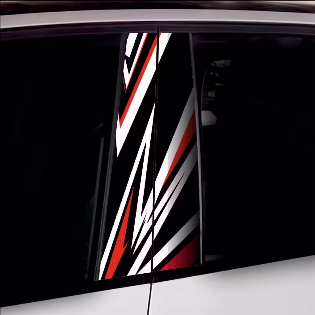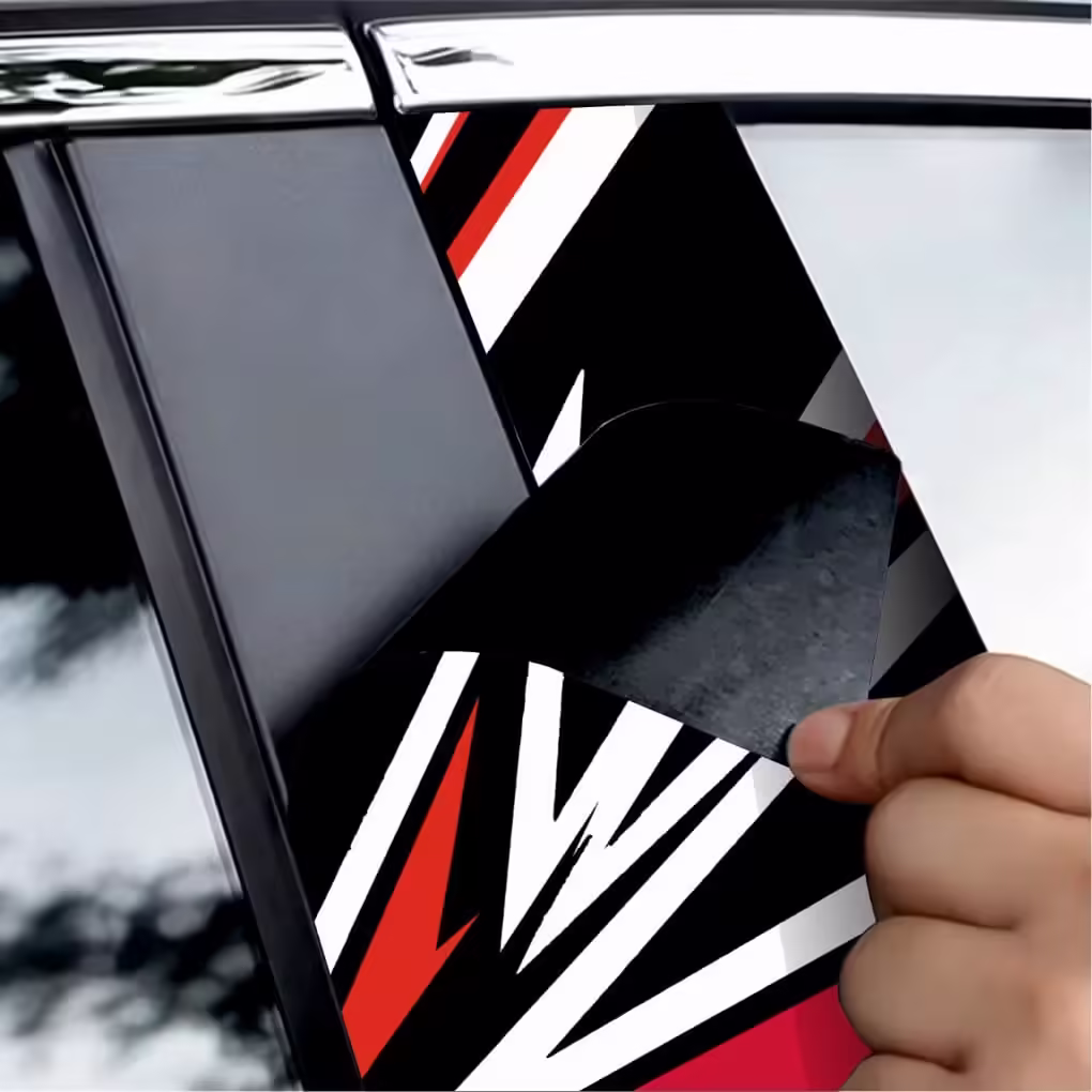 Set 2 folii printate outdoor pentru colantarea stâlpilor ușilor autoturismului dvs. Folia imprimată cu EcoSolvent Outdoor aderă pe orice suprafață plană, netedă. În cazul suprafețelor rugoase, aderența produsului va scadea considerabil.